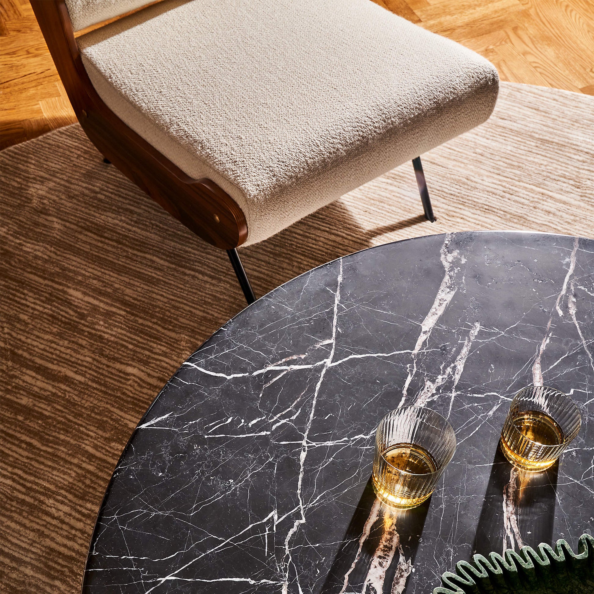 Originally designed by Gianfranco Frattini in the 1950s, this armless lounge chair captures the quiet precision of Italian modernism at its best. Updated in a rich ivory wool blend with sculptural black metal legs and warm walnut side panels, it’s a piece that commands attention—especially in profile, where the silhouette reveals its architectural soul. Finished with Frattini’s signature brass snake-eye bolts, it’s a masterclass in restraint, crafted for a new generation of collectors.